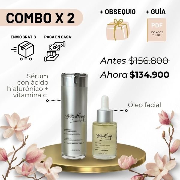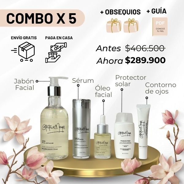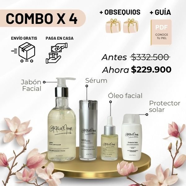 Nuestra colección profesional, diseñada desde mi experiencia en belleza, ofrece kits X2, X3, X4, X5 y individuales con obsequios gratuitos. El Kit Facial Profesional incluye Jabón Limpiador, Serum Antienvejecimiento, Óleo, Contorno de Ojos y Protector Solar, los puedes combinar como desees, proporcionando una rutina completa y efectiva.